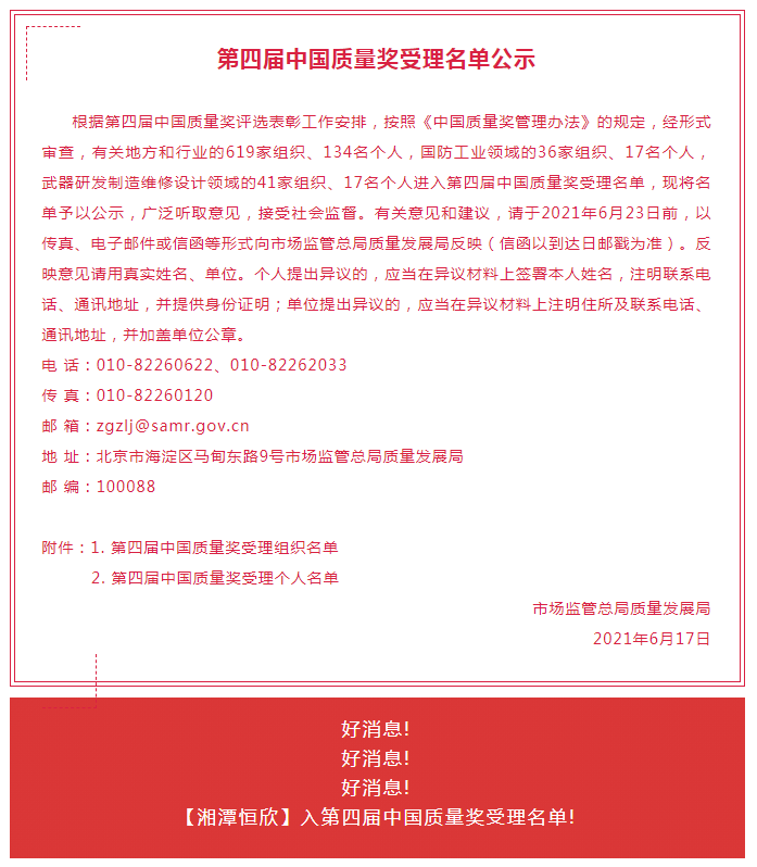 xiao12666@163.com【湘潭恒欣】入第四屆中國質(zhì)量獎(jiǎng)受理名單