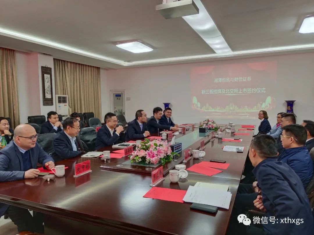 參觀(guān)后進(jìn)入會(huì)議室觀(guān)看企業(yè)宣傳片,肖董事長(zhǎng)向龍海彧副總裁一行的到來(lái)表示歡迎并簡(jiǎn)要介紹公司的情況和發(fā)展規(guī)劃。隨后龍海彧副總裁和李云祥副首席代表分別進(jìn)行了致辭,韶山市副市長(zhǎng)易繼輝發(fā)表了講話(huà)。并在大家的見(jiàn)證下,【湘潭恒欣】肖公平和財(cái)信證券副總裁龍海彧簽訂了新三板掛牌及北交所上市協(xié)議。