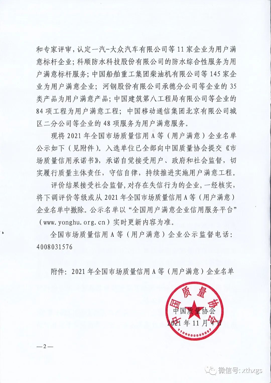 在企業(yè)自愿申請基礎(chǔ)上,經(jīng)市場用戶評價和中質(zhì)協(xié)組織的專家現(xiàn)場評審后,認(rèn)定了包括【湘潭恒欣】、格力電器、一汽大眾等在內(nèi)的11家企業(yè)為用戶滿意標(biāo)桿企業(yè)(市場質(zhì)量信用AAA)。