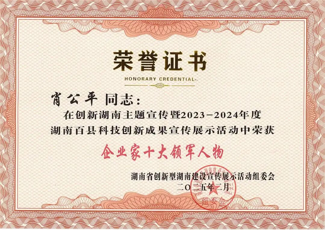 在“創(chuàng)新湖南主題宣傳暨2023-2024年度湖南百縣科技創(chuàng)新成果宣傳展示活動”中,【恒欣股份】董事長肖公平榮獲“企業(yè)家領軍人物”稱號。
