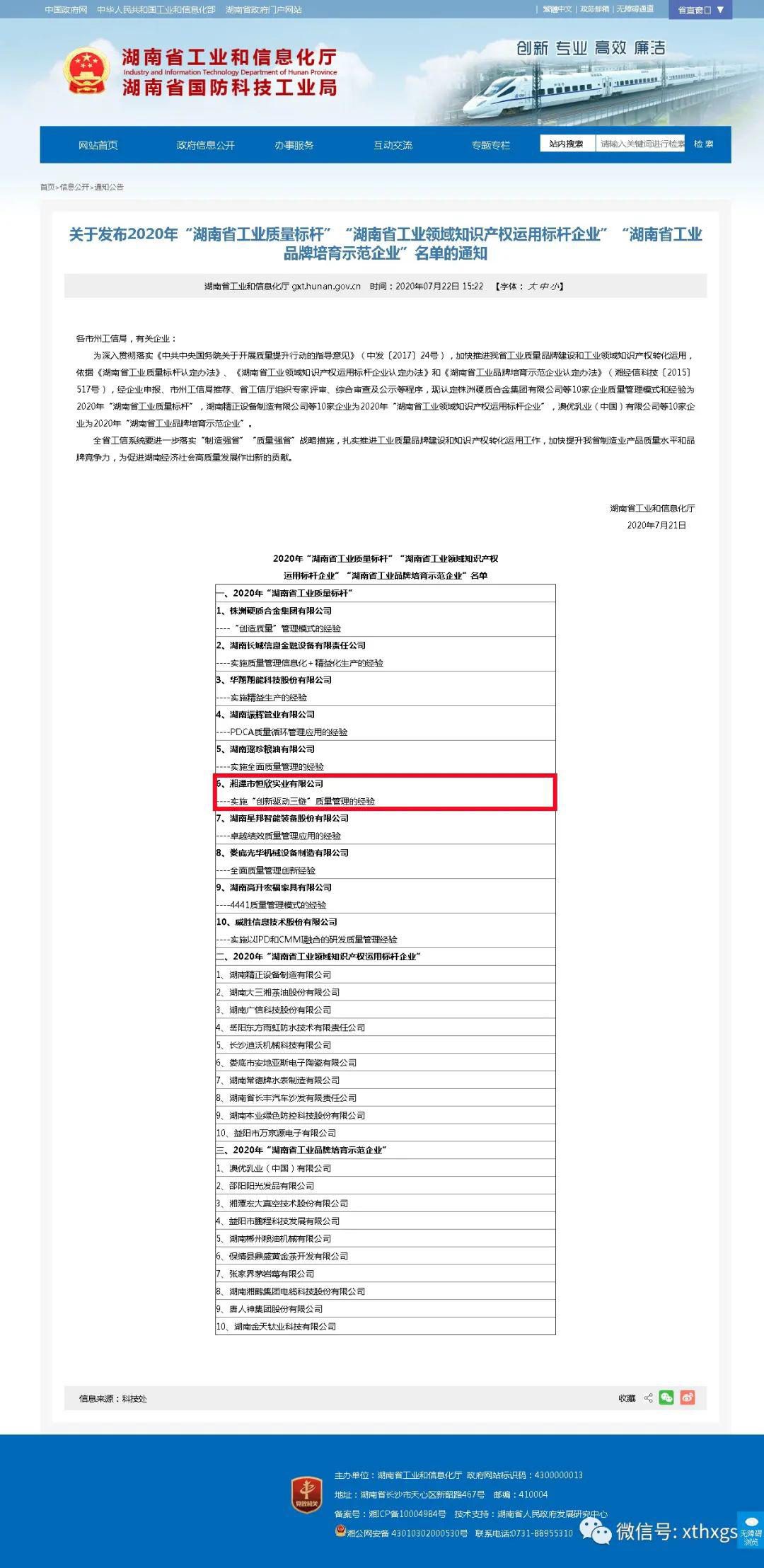 xiao12666@163.com熱烈慶?!鞠嫣逗阈馈勘徽J(rèn)定為2020年“湖南省工業(yè)質(zhì)量標(biāo)桿”