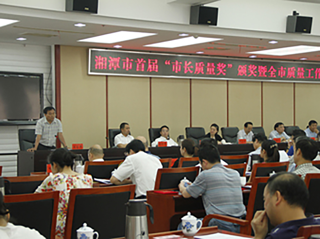 6月13日,湘潭市首屆“市長(zhǎng)質(zhì)量獎(jiǎng)”頒獎(jiǎng)暨全市質(zhì)量工作會(huì)議在湘潭市政府會(huì)議室召開(kāi),省質(zhì)量技術(shù)監(jiān)督局蔣新祺局長(zhǎng)、湘潭市委副書(shū)記、市長(zhǎng)胡偉林、副市長(zhǎng)吳小月等領(lǐng)導(dǎo)參加了會(huì)議。