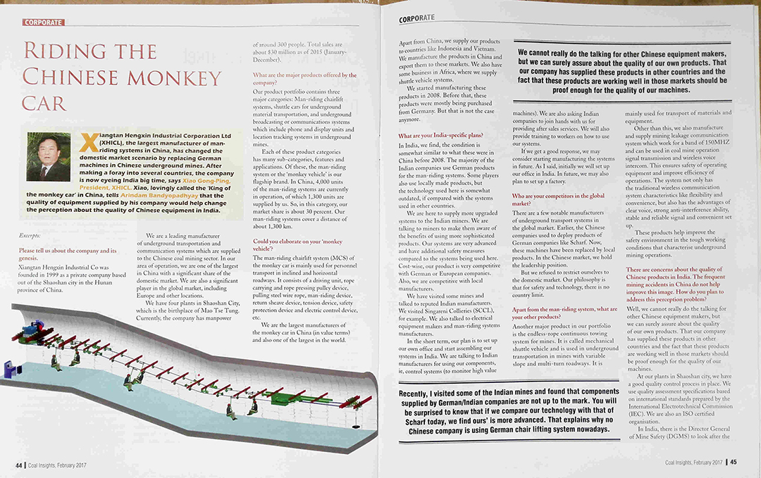 2016年12月,【湘潭恒欣】董事長(zhǎng)肖公平攜恒欣技術(shù)團(tuán)隊(duì)隨中國煤監(jiān)局訪問印度各大煤礦公司及DGMS(印度礦山安全管理總局)。印度“Coal Insight”《煤業(yè)洞悉》雜志在中國考察團(tuán)到訪印度期間,邀請(qǐng)【湘潭恒欣】董事長(zhǎng)肖公平進(jìn)行專訪,并登上全球同步發(fā)行的2017年2月刊。作為印度煤礦行業(yè)最權(quán)威的媒體,《煤業(yè)洞悉》影響力舉足輕重。該雜志高度評(píng)價(jià)了【湘潭恒欣】在行業(yè)中的地位以及肖公平董事長(zhǎng)帶領(lǐng)團(tuán)隊(duì)所取得的成績(jī),并圍繞【湘潭恒欣】公司背景,產(chǎn)品信息,進(jìn)軍印度乃至全球市場(chǎng)的計(jì)劃進(jìn)行了高端訪談。