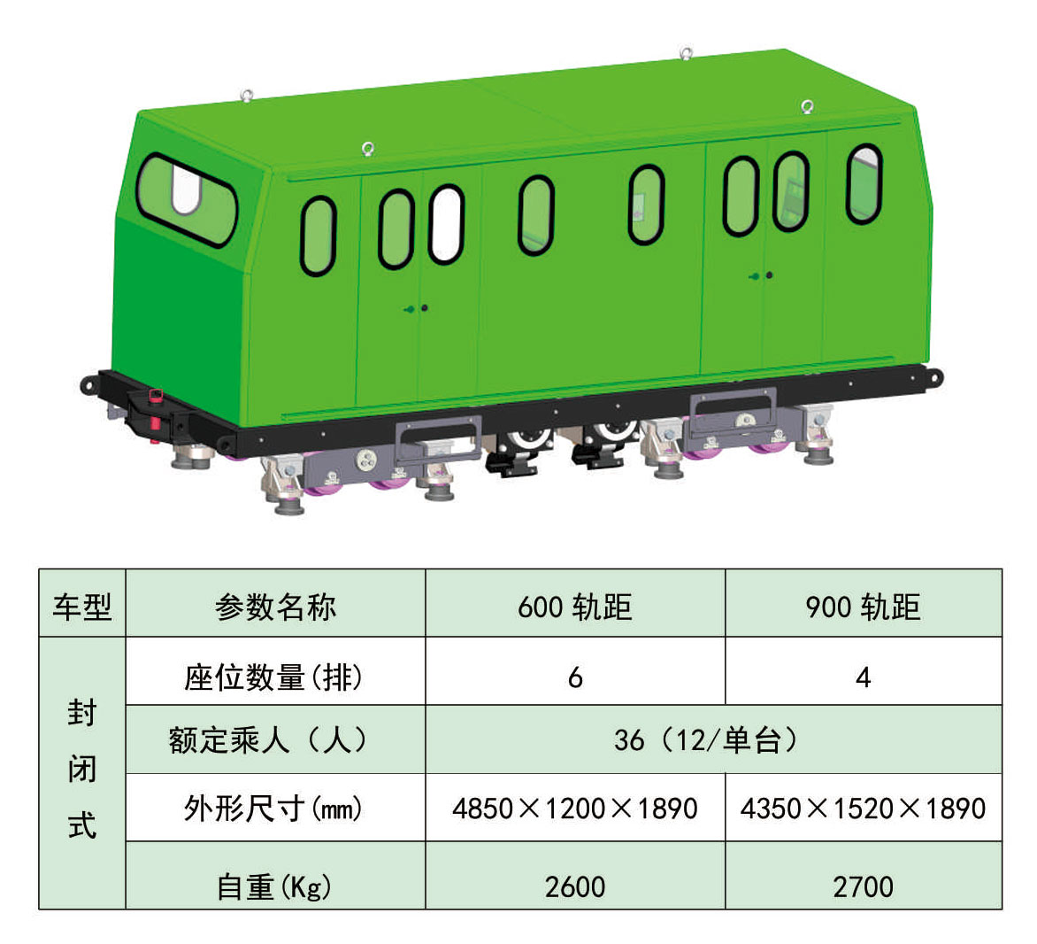 卡軌車乘人車主要為人員乘坐車廂,車架連有轉(zhuǎn)向架和減震器,能夠更好保證乘人車平穩(wěn)、順暢的通過(guò)水平彎道、起伏坡道及陰陽(yáng)軌等工況,可滿足最小水平轉(zhuǎn)彎半徑9m,最小垂直轉(zhuǎn)彎半徑15m的軌道運(yùn)行。根據(jù)結(jié)構(gòu)形式分為半敞式和封閉式。