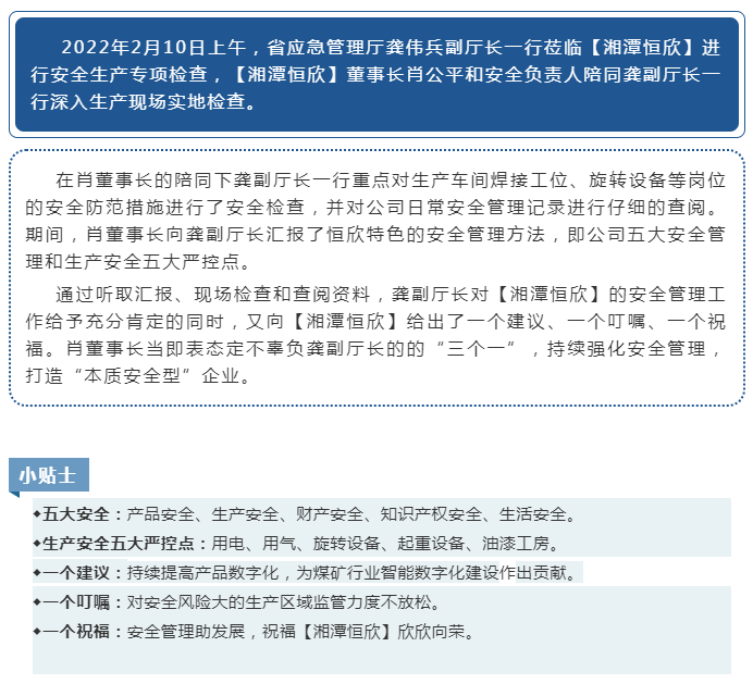 省應(yīng)急管理廳龔偉兵副廳長(zhǎng)帶隊(duì)蒞臨【湘潭恒欣】檢查企業(yè)復(fù)工復(fù)產(chǎn)安全防范工作