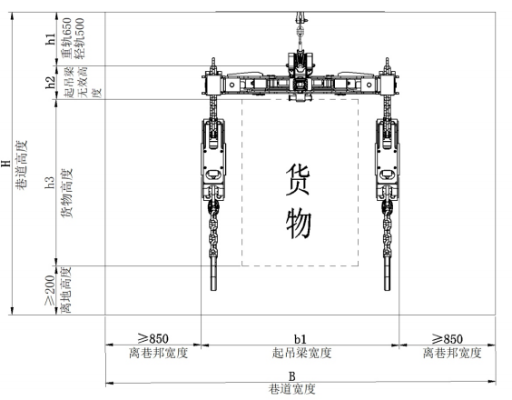 方式一:起吊梁位于中間位置,適用于巷道空間充足的運輸情況,司機開車時視野開闊,采用葫蘆起吊梁,也可拆解為小噸位起吊梁,用于運輸平板車、礦車等小型貨物。