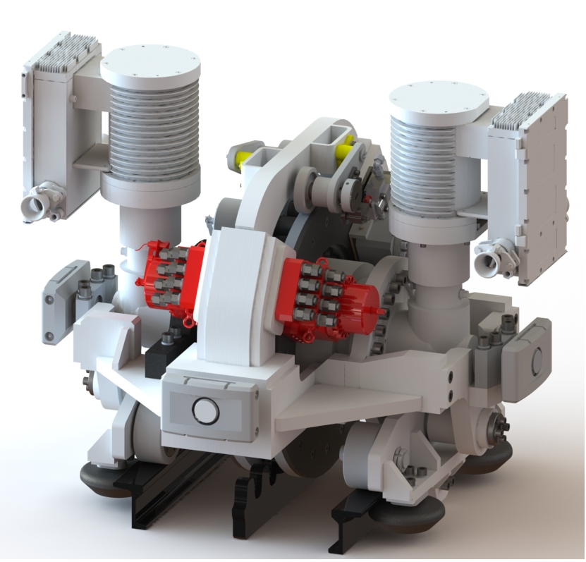 主要由變頻調(diào)速一體機(jī)、行星減速機(jī)、工作制動(dòng)器、停車(chē)制動(dòng)器、驅(qū)動(dòng)輪、編碼器測(cè)速裝置、離心限速裝置、驅(qū)動(dòng)支架、車(chē)輪擺架、卡軌輪、導(dǎo)向輪等組成,單個(gè)驅(qū)動(dòng)單元的驅(qū)動(dòng)力:22KW變頻調(diào)速一體機(jī)的牽引力為55KN,45KW變頻調(diào)速一體機(jī)的牽引力為135KN。