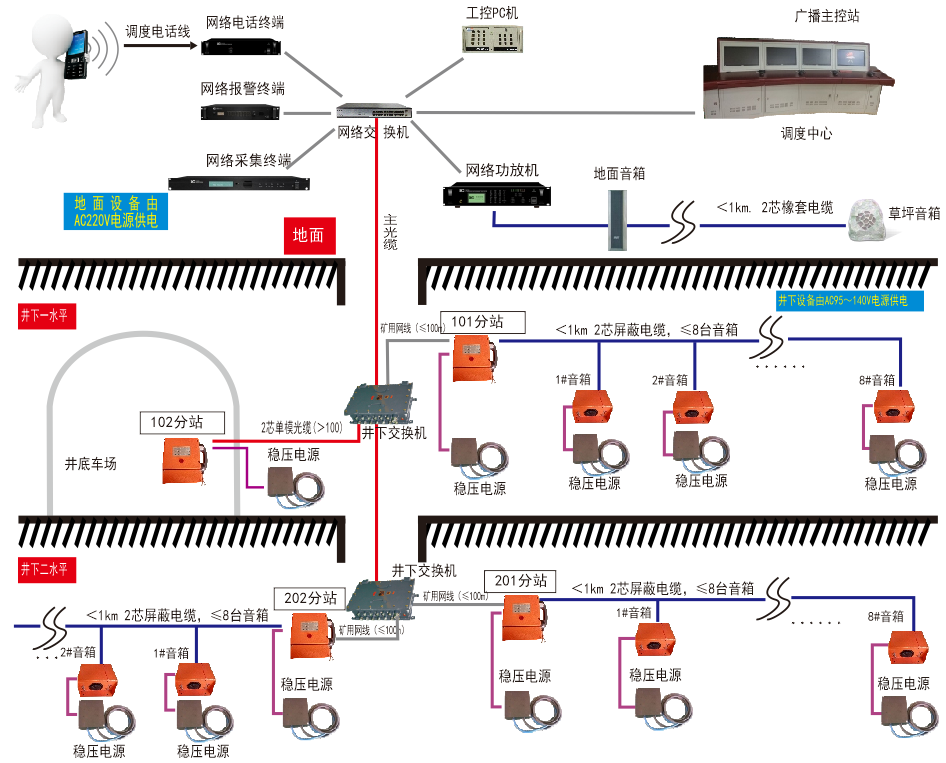 ◆  系統(tǒng)采用“光電”傳輸:井下交換機(jī)至分站利用礦用光纜傳輸,分站至音箱利用礦用屏 蔽電纜傳輸;