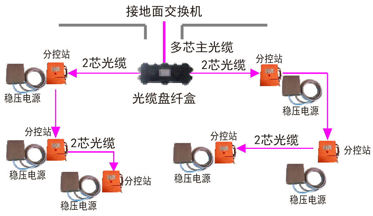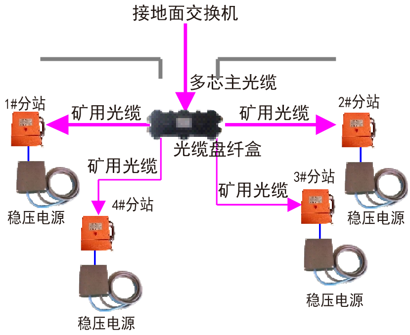 ◆ 多芯主光纜直接連接至地面交換機(jī),利用光纜盤纖盒分支連接至分站。