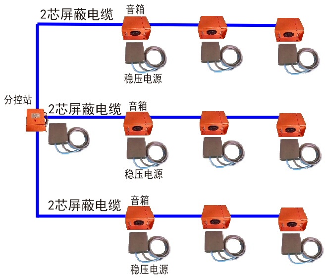 ◆ 音箱通過屏蔽電纜接入分站(允許多支路接入);