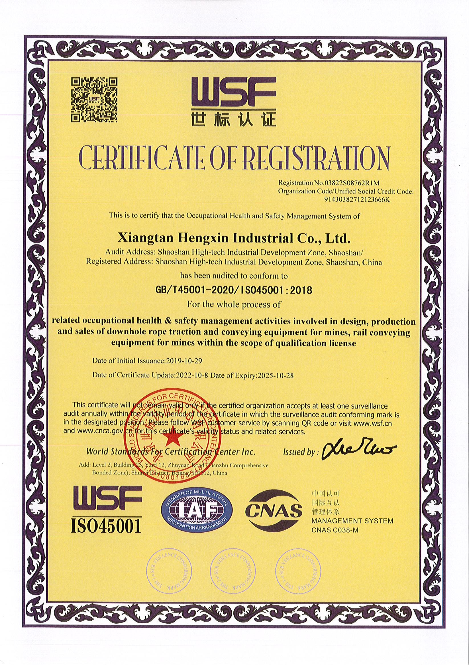 職業(yè)健康安全管理體系認(rèn)證證書(中文/英文)